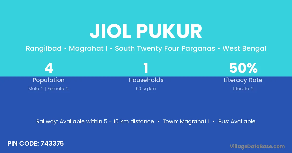 Jiol Pukur village has a total population of 4 people, of which 2 are males and 2 are females.