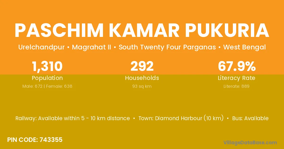 Diamond Harbour (10 km) is the nearest town to Paschim Kamar Pukuria village for major economic activities and is located approximately 10 km away.