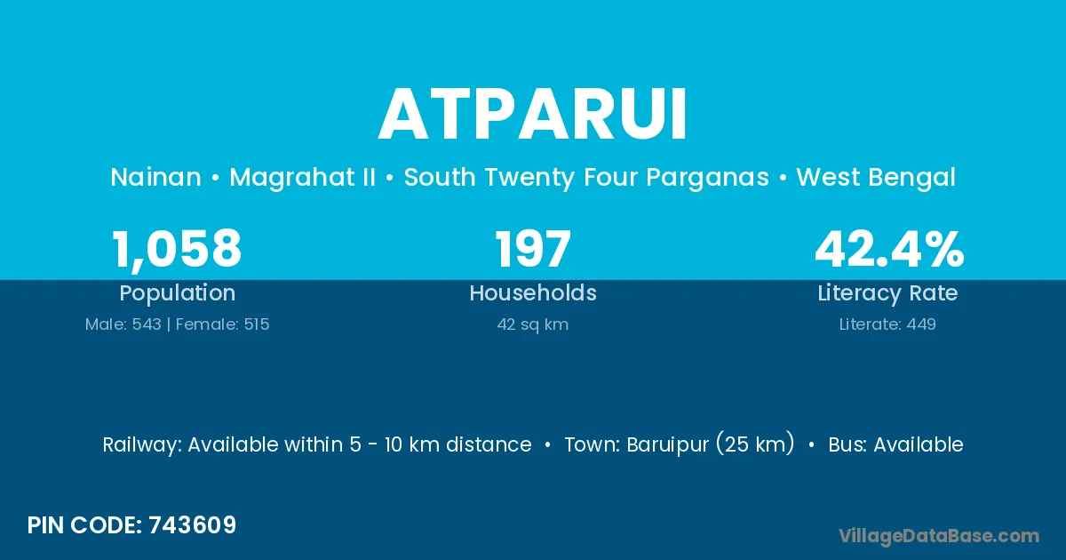 Baruipur (25 km) is the nearest town to Atparui village for major economic activities and is located approximately 25 km away.