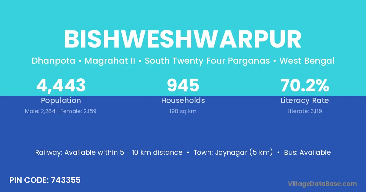 Bishweshwarpur village is located in the Magrahat II Subdivision of the South Twenty Four Parganas district in West Bengal.