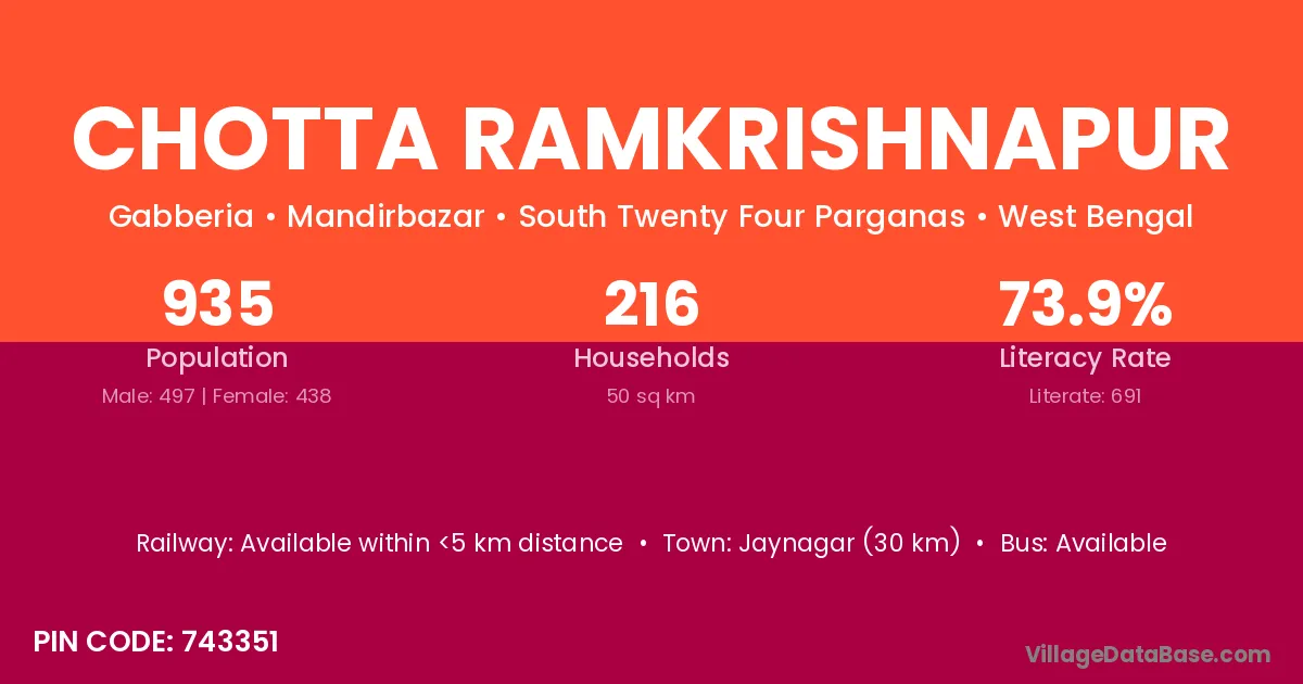 Chotta Ramkrishnapur village has a total population of 935 people, of which 497 are males and 438 are females.