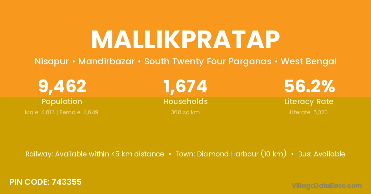 Diamond Harbour (10 km) is the nearest town to Mallikpratap village for major economic activities and is located approximately 10 km away.