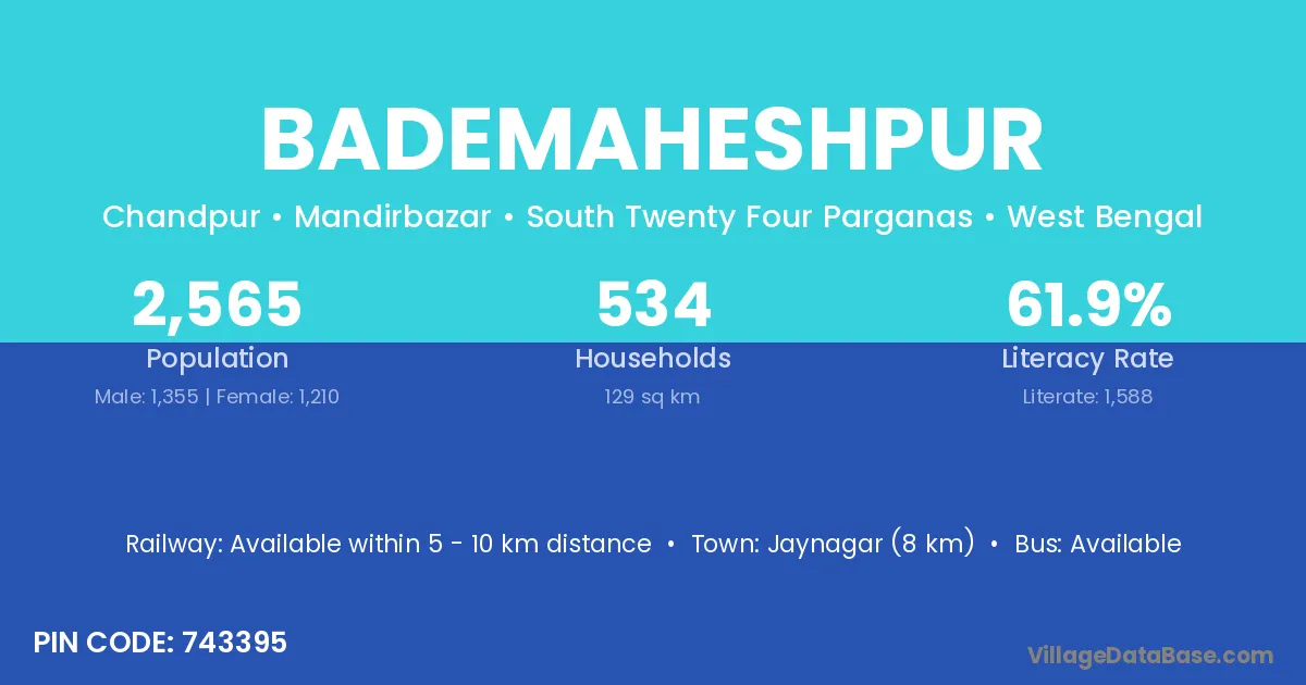 Jaynagar (8 km) is the nearest town to Bademaheshpur village for major economic activities and is located approximately 8 km away.
