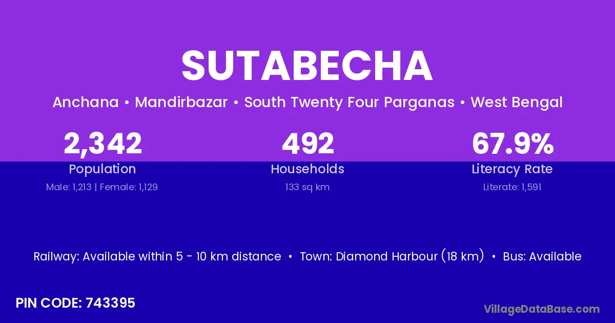 Diamond Harbour (18 km) is the nearest town to Sutabecha village for major economic activities and is located approximately 18 km away.