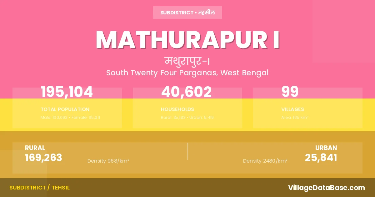 According to the 2011 census The total area of Mathurapur I Subdivision is 185 km², with a population of 195104 people. The population density is 1,053 inhabitants per square kilometre, and there are approximately 40602 houses in the sub district.