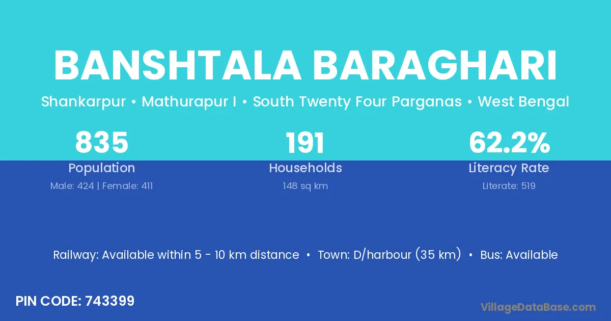 D/harbour (35 km) is the nearest town to Banshtala Baraghari village for major economic activities and is located approximately 35 km away.