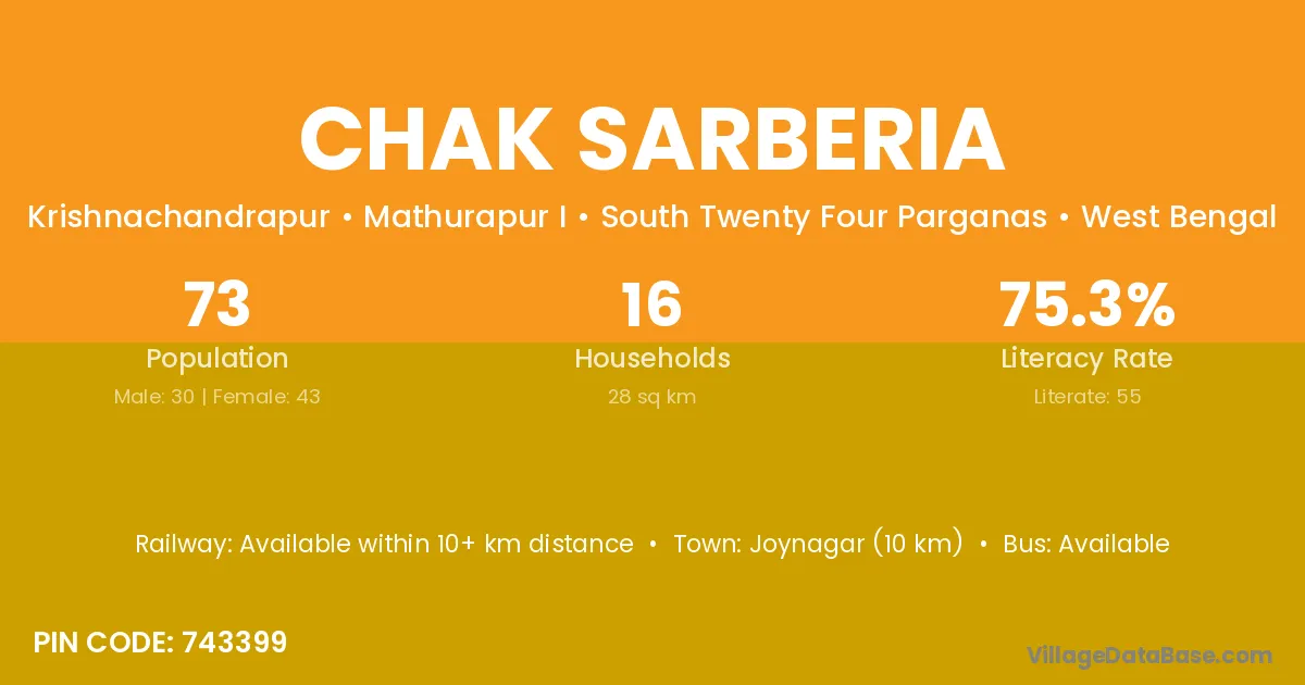 Joynagar (10 km) is the nearest town to Chak Sarberia village for major economic activities and is located approximately 10 km away.