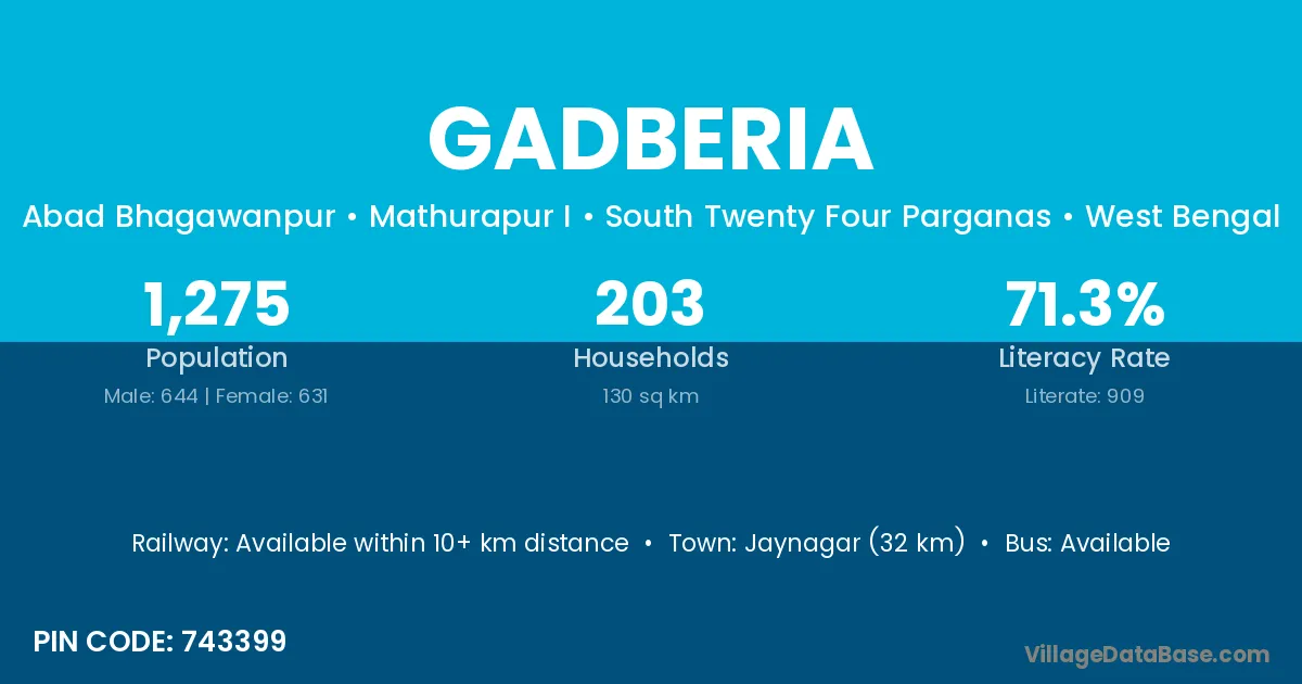 According to Census 2011 information, the village code of Gadberia village is 743399.