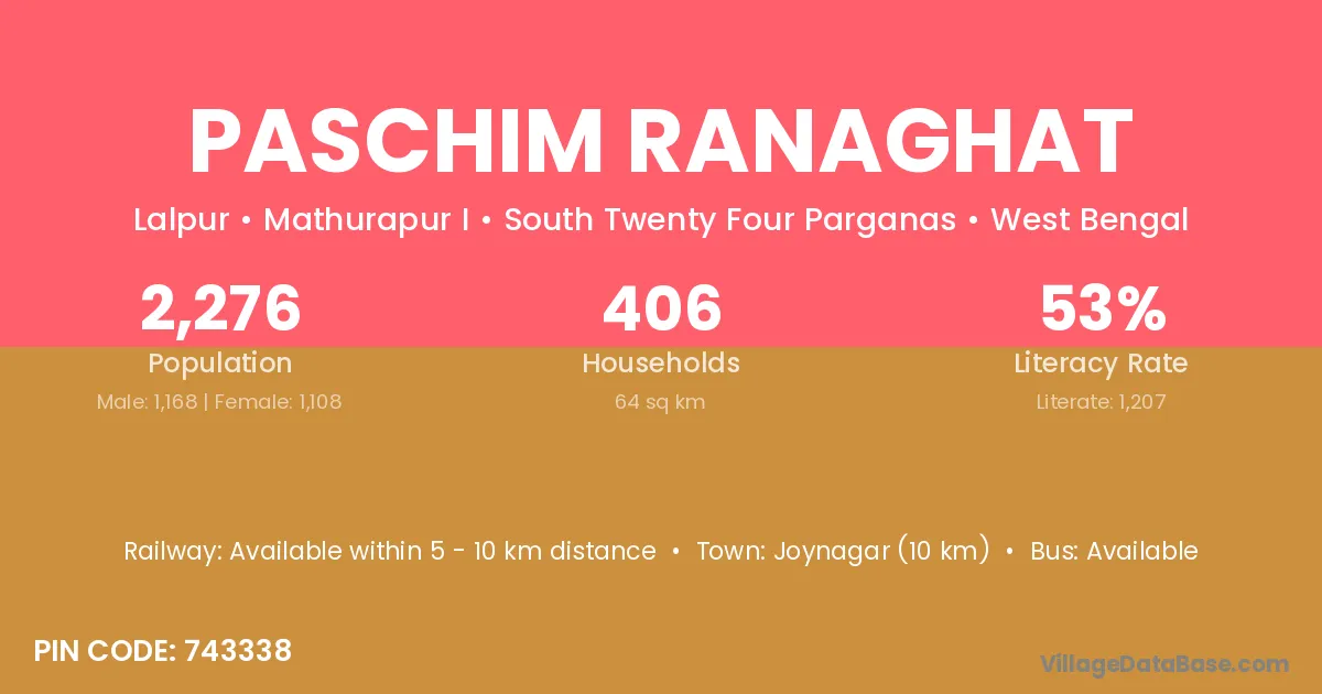 Joynagar (10 km) is the nearest town to Paschim Ranaghat village for major economic activities and is located approximately 10 km away.