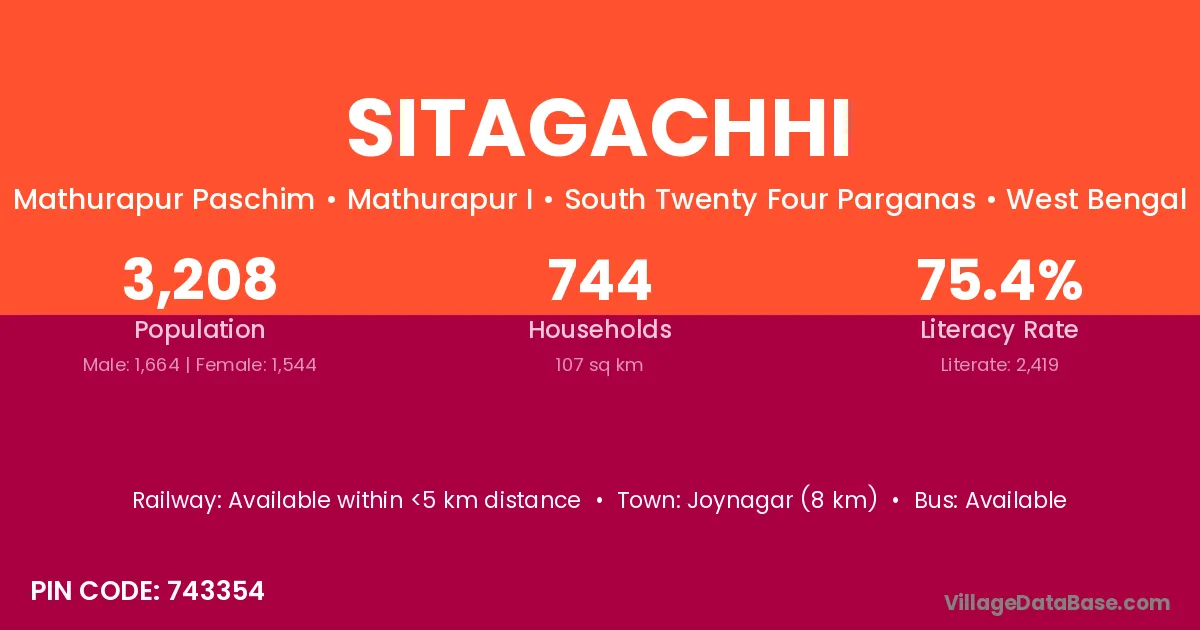 Joynagar (8 km) is the nearest town to Sitagachhi village for major economic activities and is located approximately 8 km away.