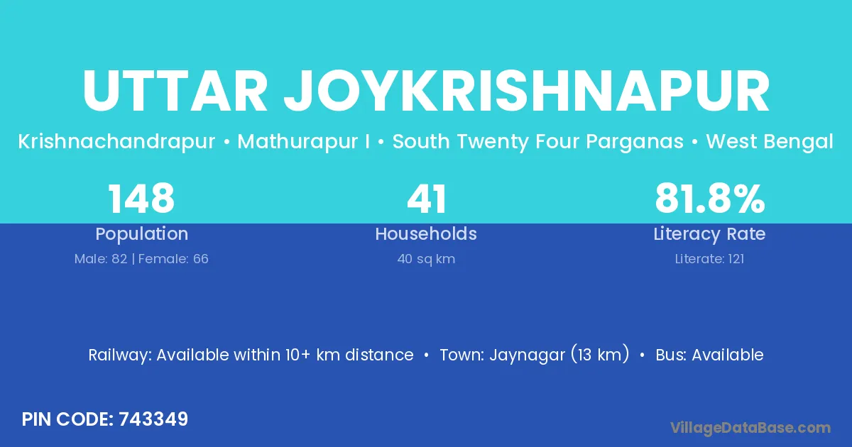 Uttar Joykrishnapur village has a total population of 148 people, of which 82 are males and 66 are females.