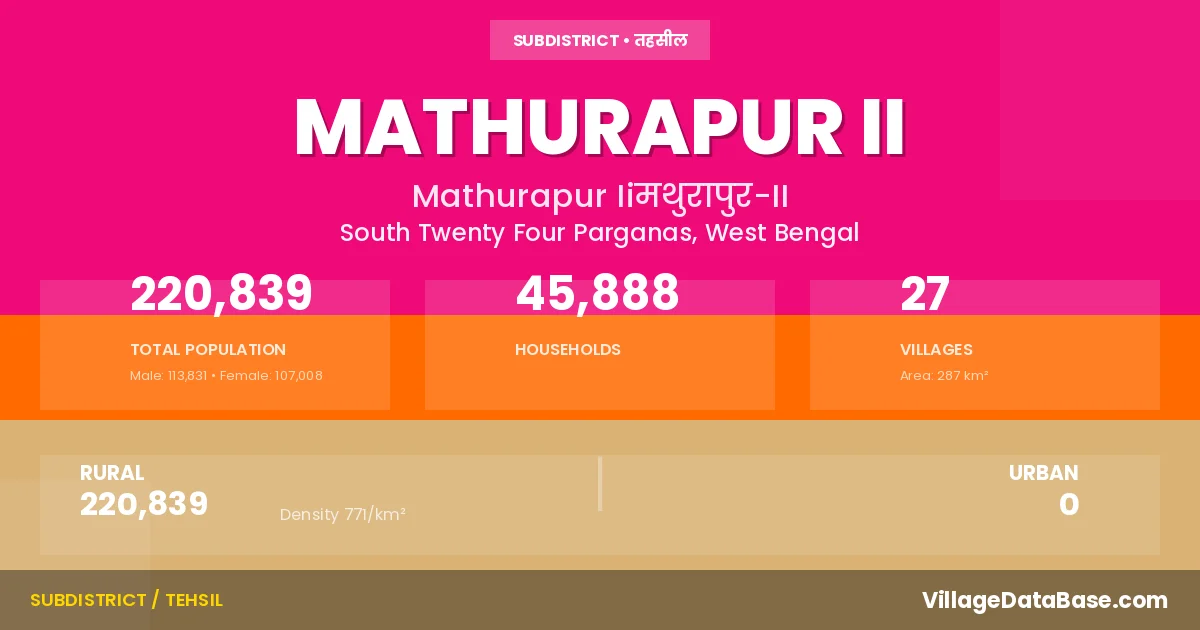 According to the 2011 census The total area of Mathurapur II Subdivision is 287 km², with a population of 220839 people. The population density is 771 inhabitants per square kilometre, and there are approximately 45888 houses in the sub district.
