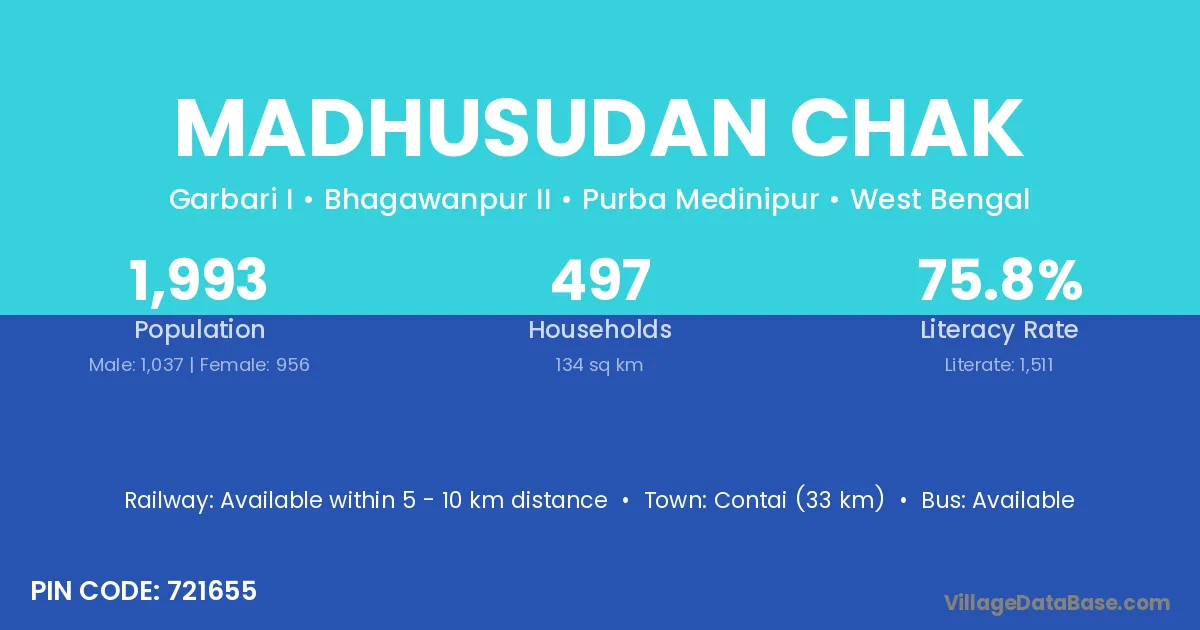 Madhusudan Chak village is located in the Mathurapur II Subdivision of the South Twenty Four Parganas district in West Bengal.