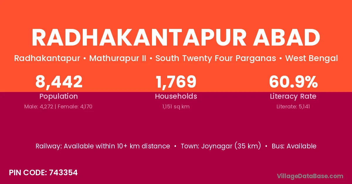 Radhakantapur Abad village has a total population of 8,442 people, of which 4,272 are males and 4,170 are females.