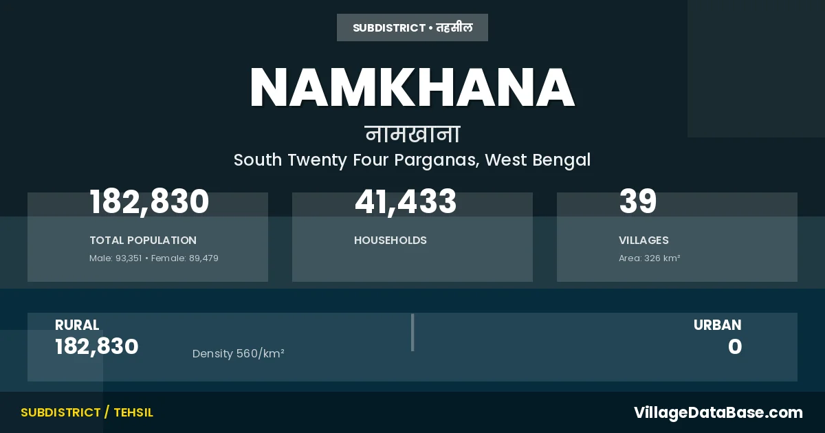 According to the 2011 census The total area of Namkhana Subdivision is 326 km², with a population of 182830 people. The population density is 560 inhabitants per square kilometre, and there are approximately 41433 houses in the sub district.
