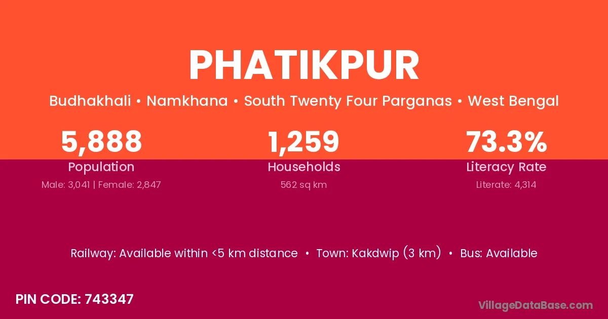 Kakdwip (3 km) is the nearest town to Phatikpur village for major economic activities and is located approximately 3 km away.