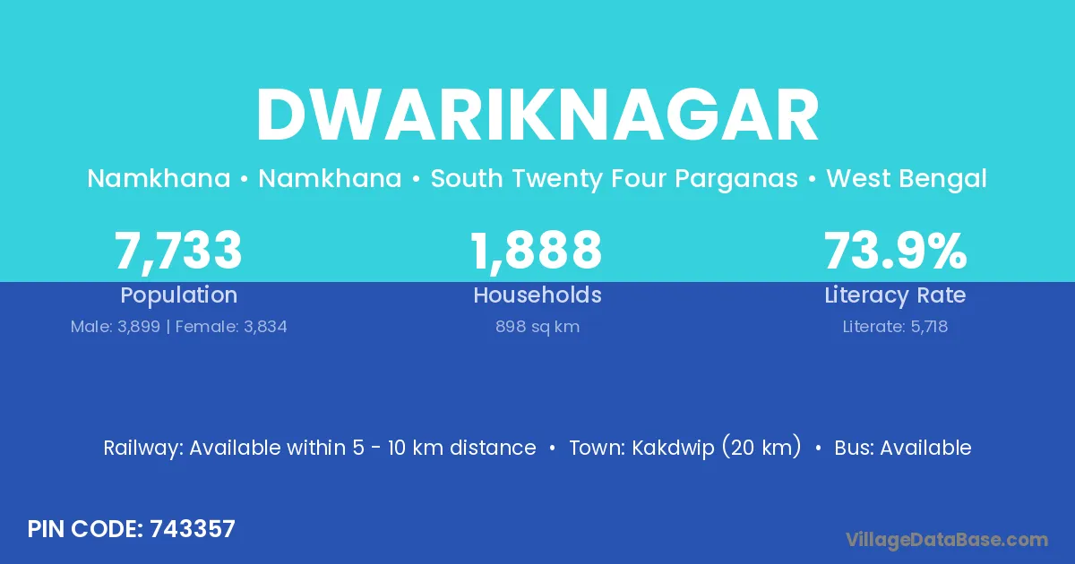 Kakdwip (20 km) is the nearest town to Dwariknagar village for major economic activities and is located approximately 20 km away.