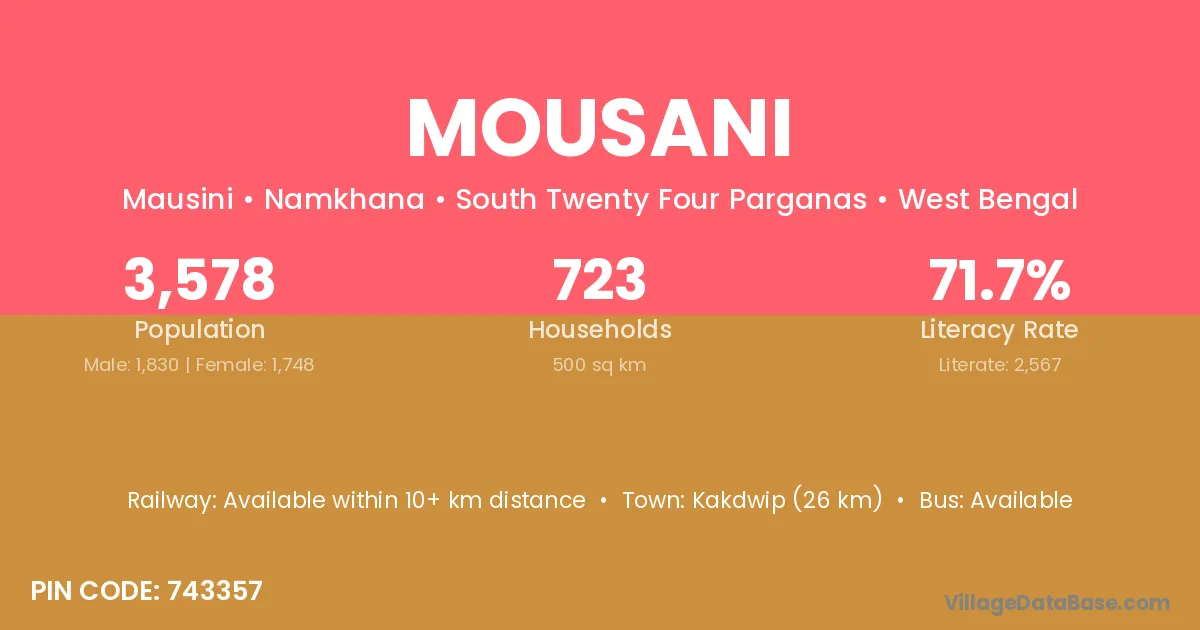 Kakdwip (26 km) is the nearest town to Mousani village for major economic activities and is located approximately 26 km away.
