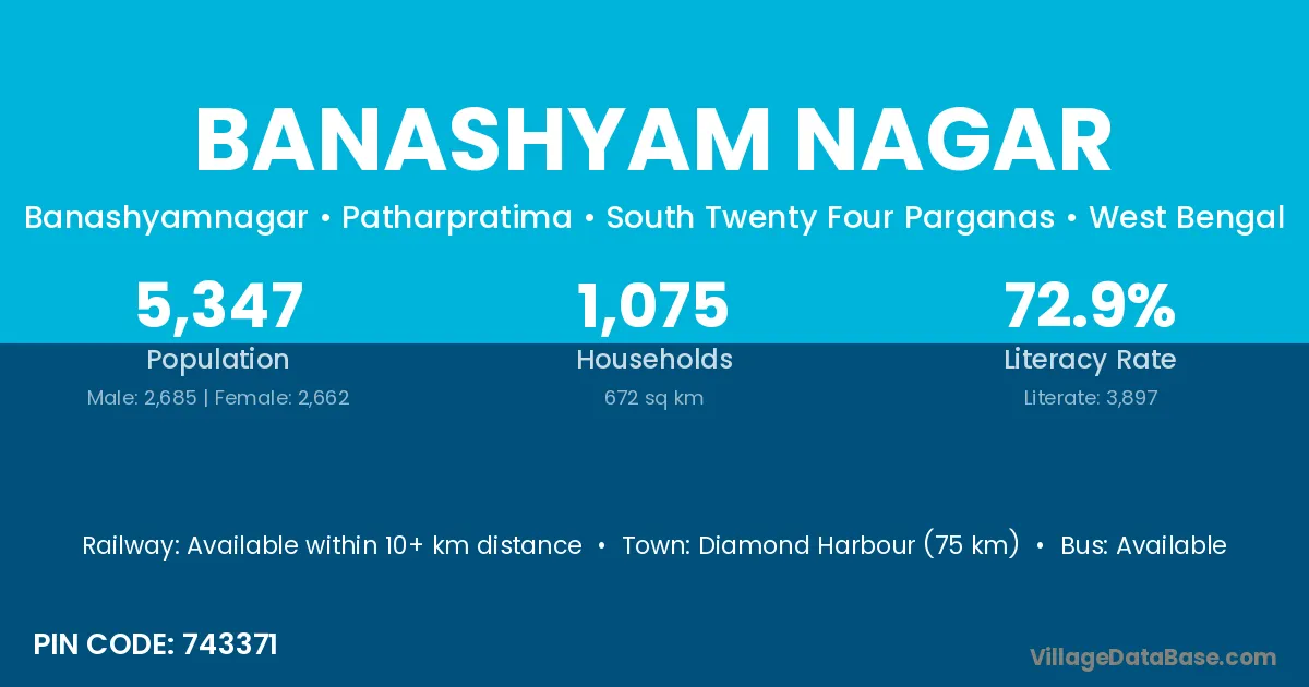 Diamond Harbour (75 km) is the nearest town to Banashyam Nagar village for major economic activities and is located approximately 75 km away.