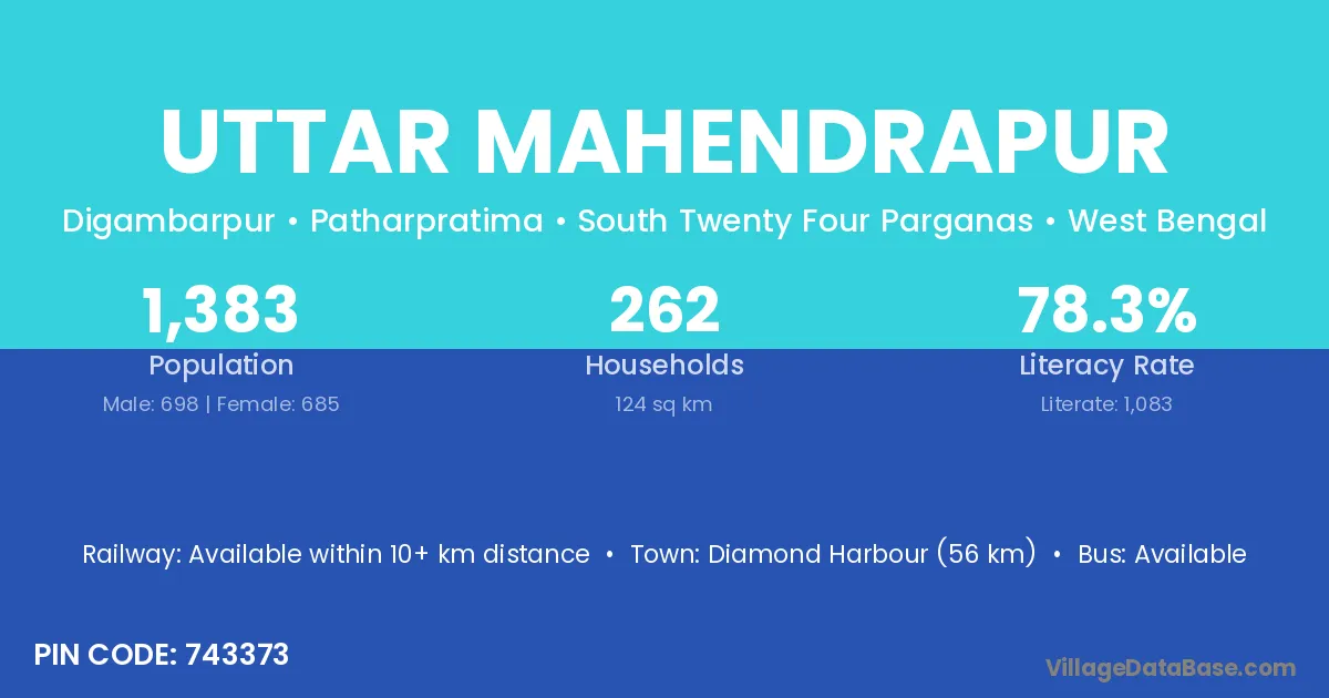 Diamond Harbour (56 km) is the nearest town to Uttar Mahendrapur village for major economic activities and is located approximately 56 km away.
