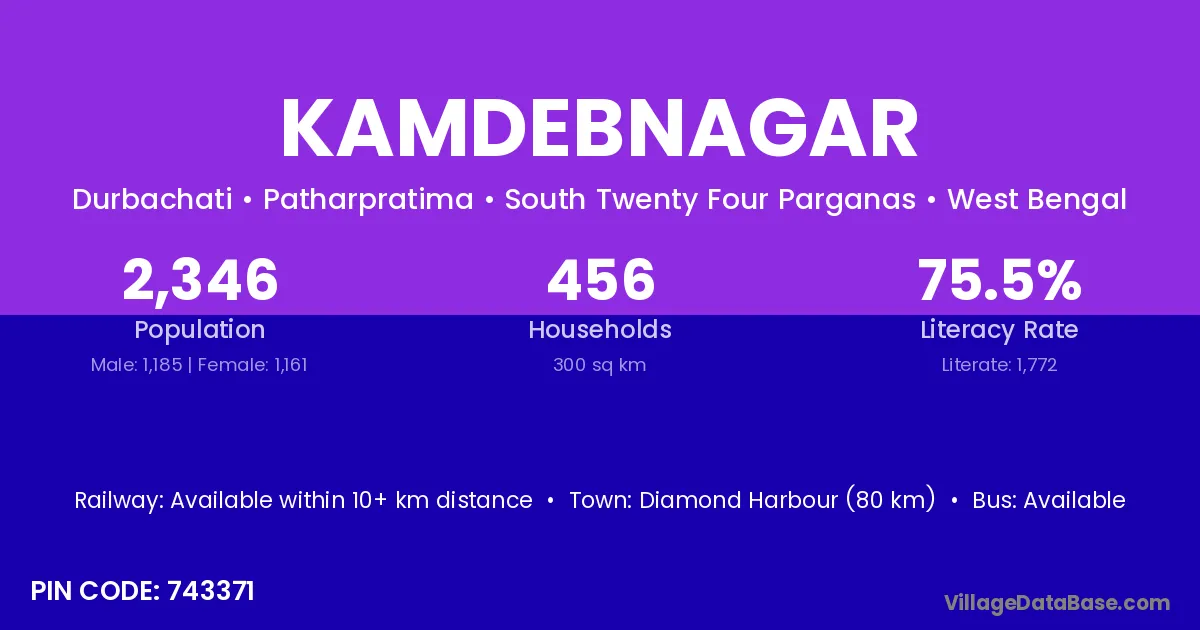 Diamond Harbour (80 km) is the nearest town to Kamdebnagar village for major economic activities and is located approximately 80 km away.