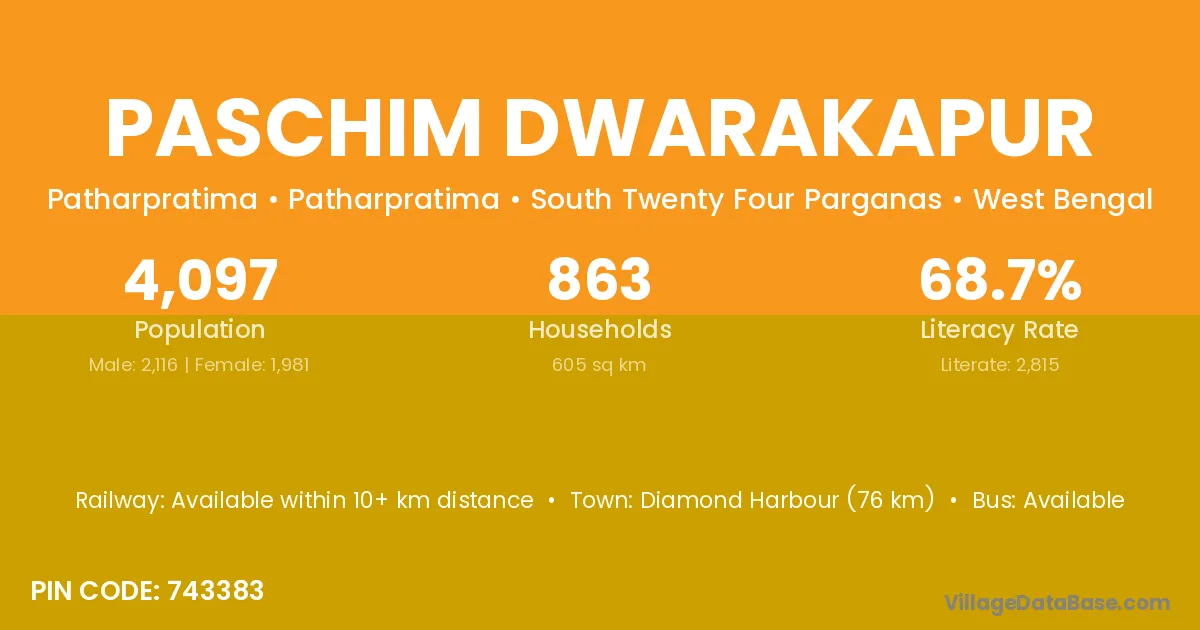 Diamond Harbour (76 km) is the nearest town to Paschim Dwarakapur village for major economic activities and is located approximately 76 km away.