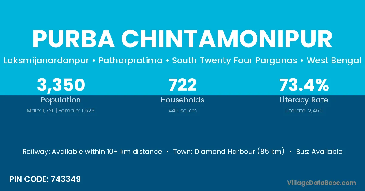 Diamond Harbour (85 km) is the nearest town to Purba Chintamonipur village for major economic activities and is located approximately 85 km away.