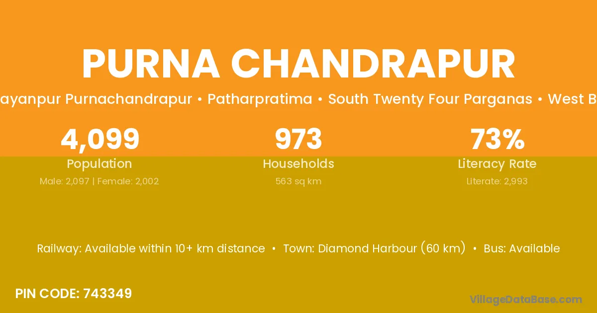 Diamond Harbour (60 km) is the nearest town to Purna Chandrapur village for major economic activities and is located approximately 60 km away.