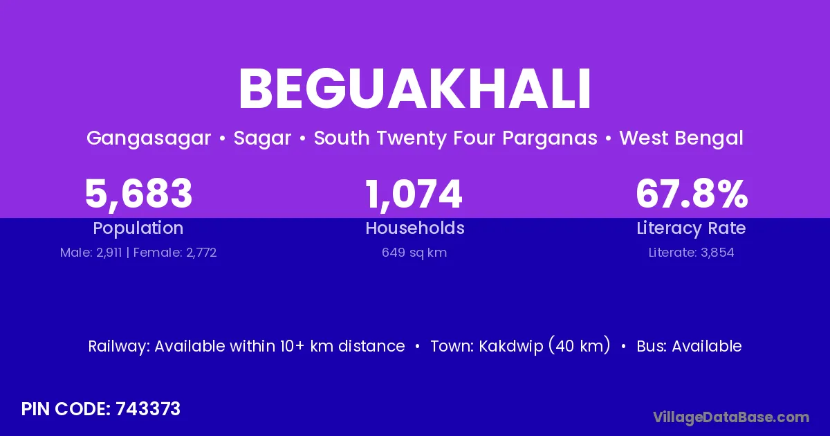 Beguakhali village is located in the Sagar Subdivision of the South Twenty Four Parganas district in West Bengal.