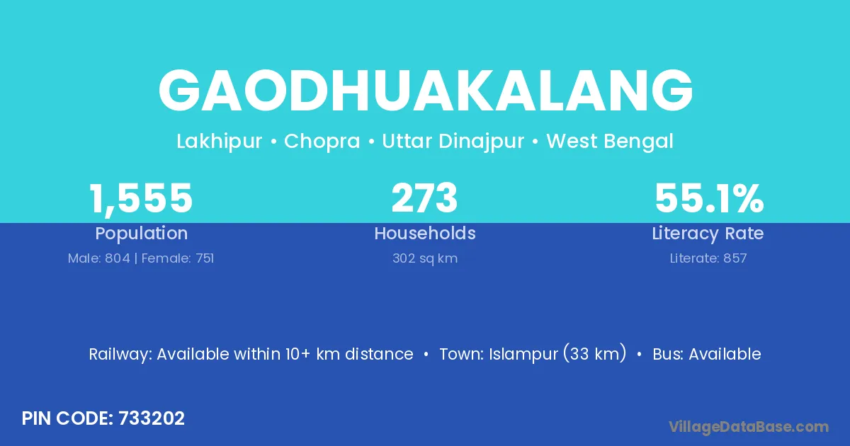 Islampur (33 km) is the nearest town to Gaodhuakalang village for major economic activities and is located approximately 33 km away.