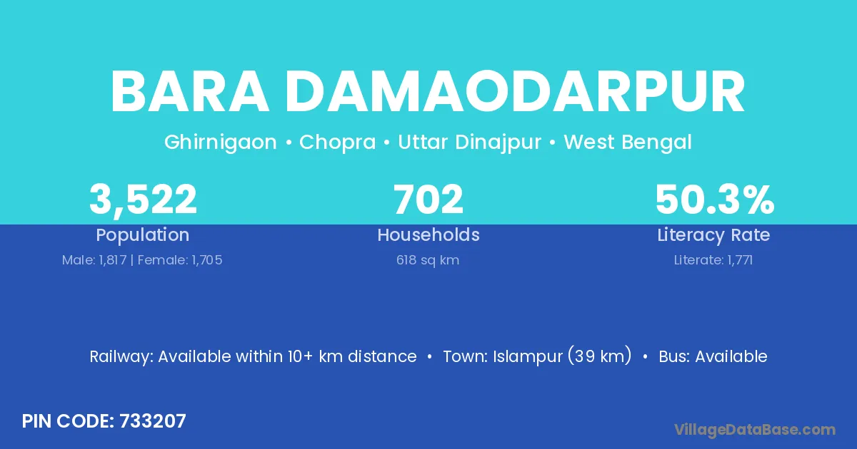 Islampur (39 km) is the nearest town to Bara Damaodarpur village for major economic activities and is located approximately 39 km away.