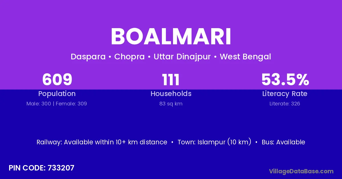 Boalmari village has a total population of 609 people, of which 300 are males and 309 are females.