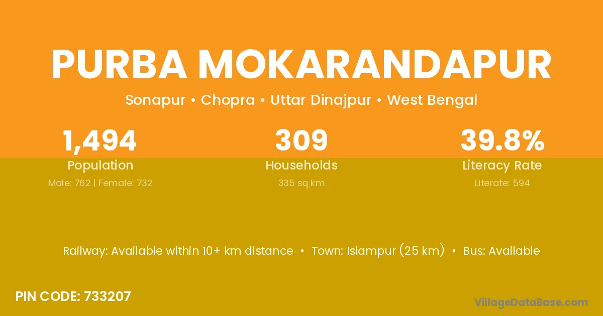 Islampur (25 km) is the nearest town to Purba Mokarandapur village for major economic activities and is located approximately 25 km away.