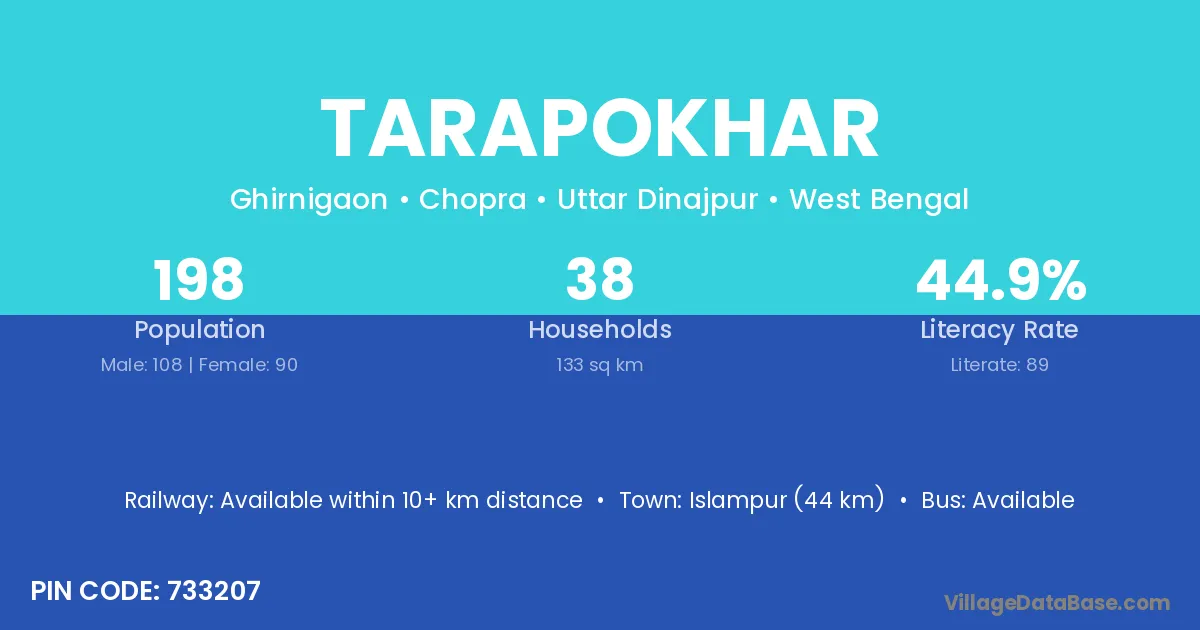 Islampur (44 km) is the nearest town to Tarapokhar village for major economic activities and is located approximately 44 km away.