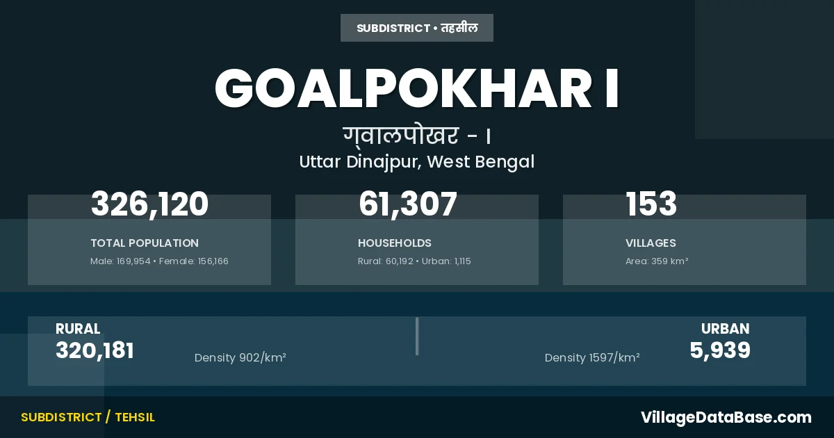 According to the 2011 census The total area of Goalpokhar I Subdivision is 359 km², with a population of 326120 people. The population density is 910 inhabitants per square kilometre, and there are approximately 61307 houses in the sub district.