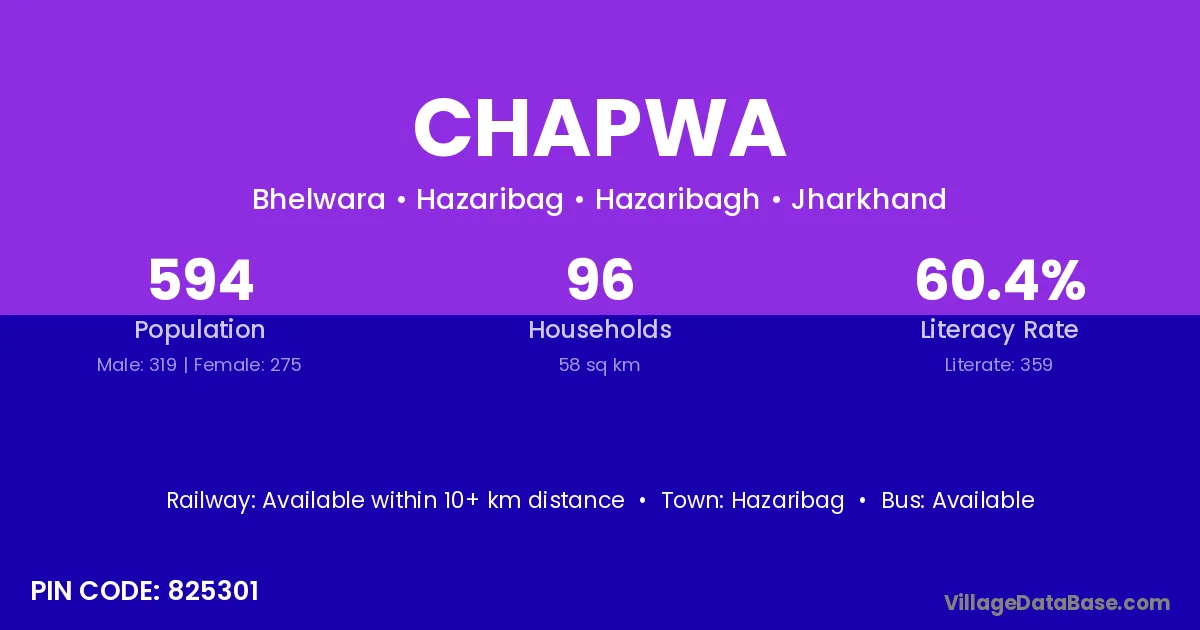 The literacy rate of Chapwa village is 26.30%. Male literacy stands at 30.85% and female literacy at 21.72%.
