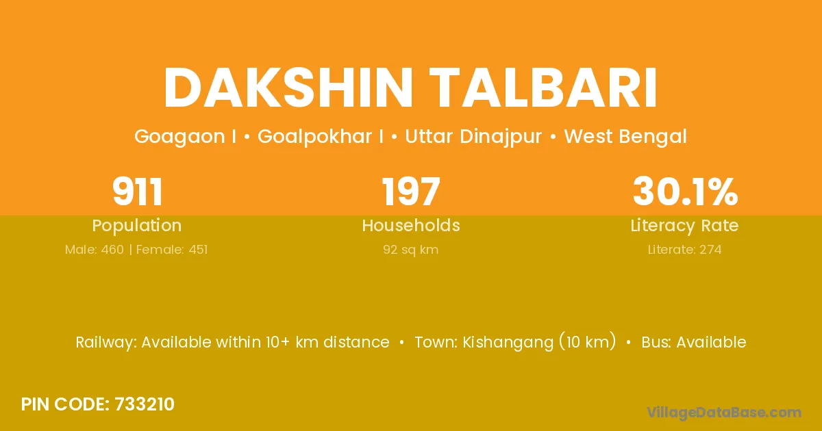 Kishangang (10 km) is the nearest town to Dakshin Talbari village for major economic activities and is located approximately 10 km away.