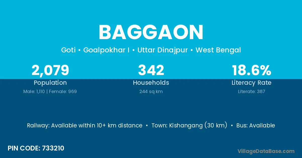 Kishangang (30 km) is the nearest town to Baggaon village for major economic activities and is located approximately 30 km away.