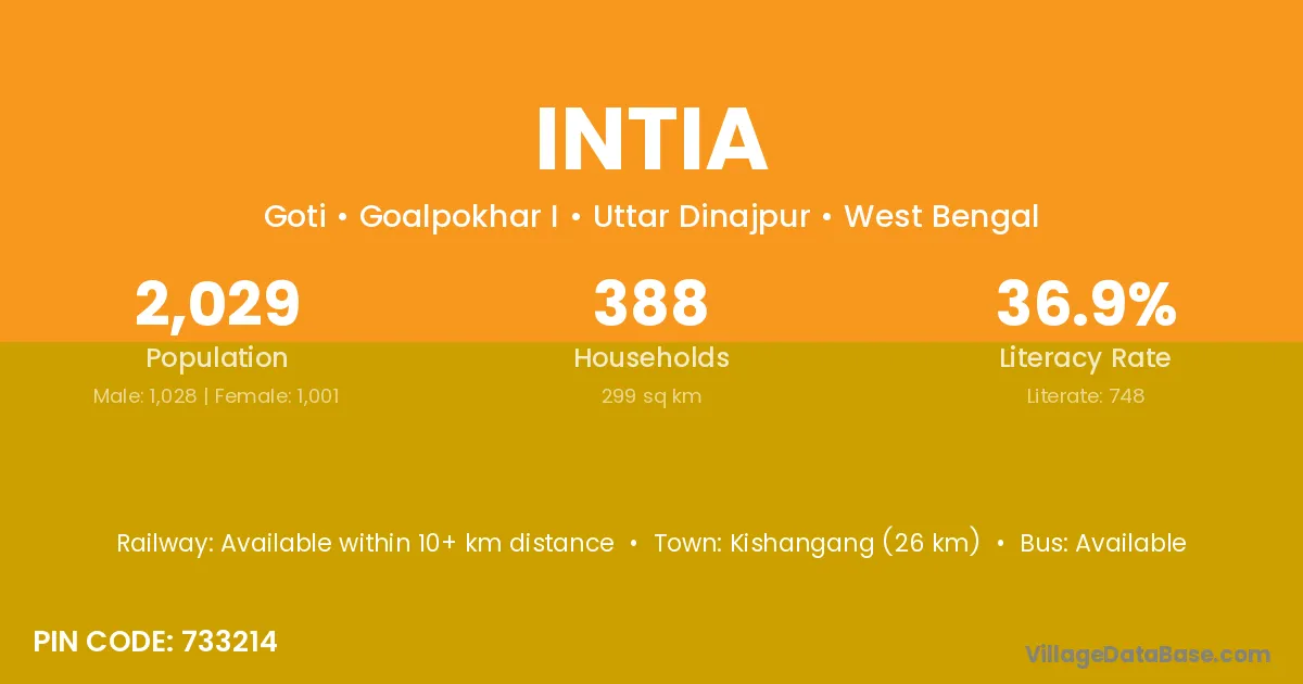 Kishangang (26 km) is the nearest town to Intia village for major economic activities and is located approximately 26 km away.
