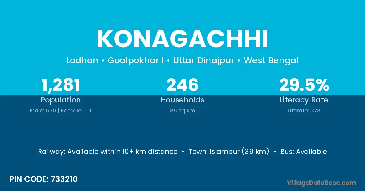 Islampur (39 km) is the nearest town to Konagachhi village for major economic activities and is located approximately 39 km away.