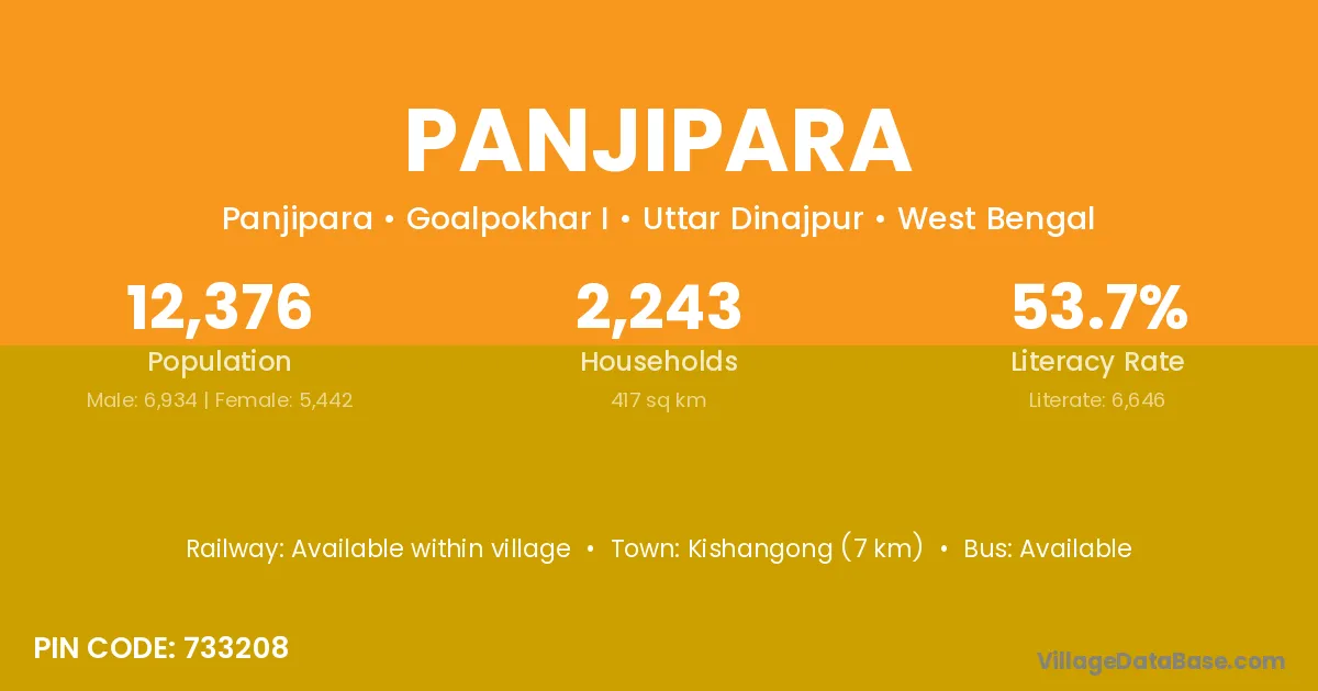 Panjipara village has a total population of 12,376 people, of which 6,934 are males and 5,442 are females.
