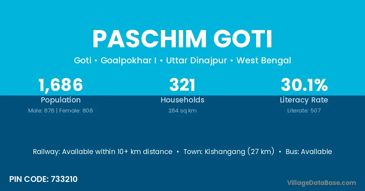 Kishangang (27 km) is the nearest town to Paschim Goti village for major economic activities and is located approximately 27 km away.