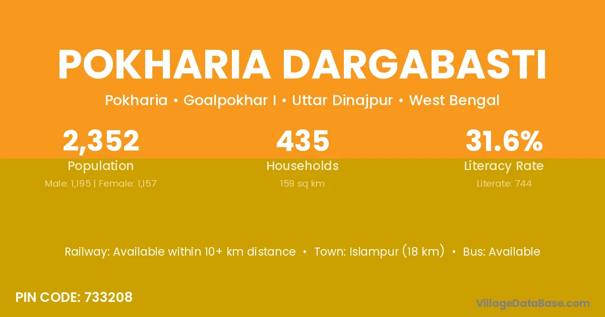 Islampur (18 km) is the nearest town to Pokharia Dargabasti village for major economic activities and is located approximately 18 km away.