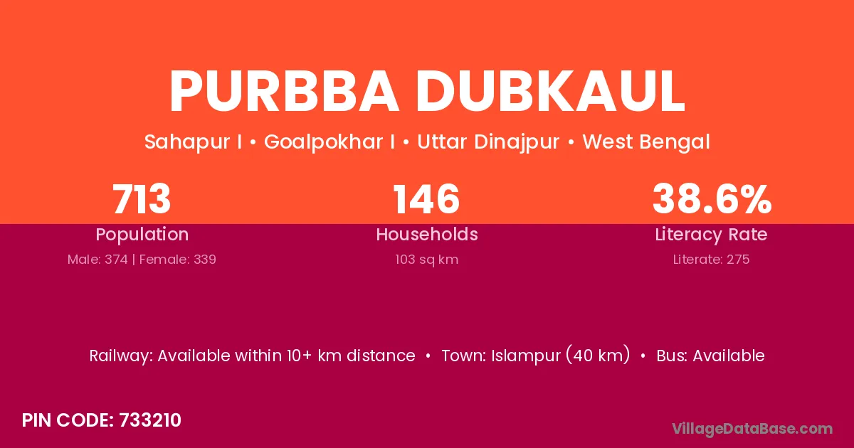 Islampur (40 km) is the nearest town to Purbba Dubkaul village for major economic activities and is located approximately 40 km away.