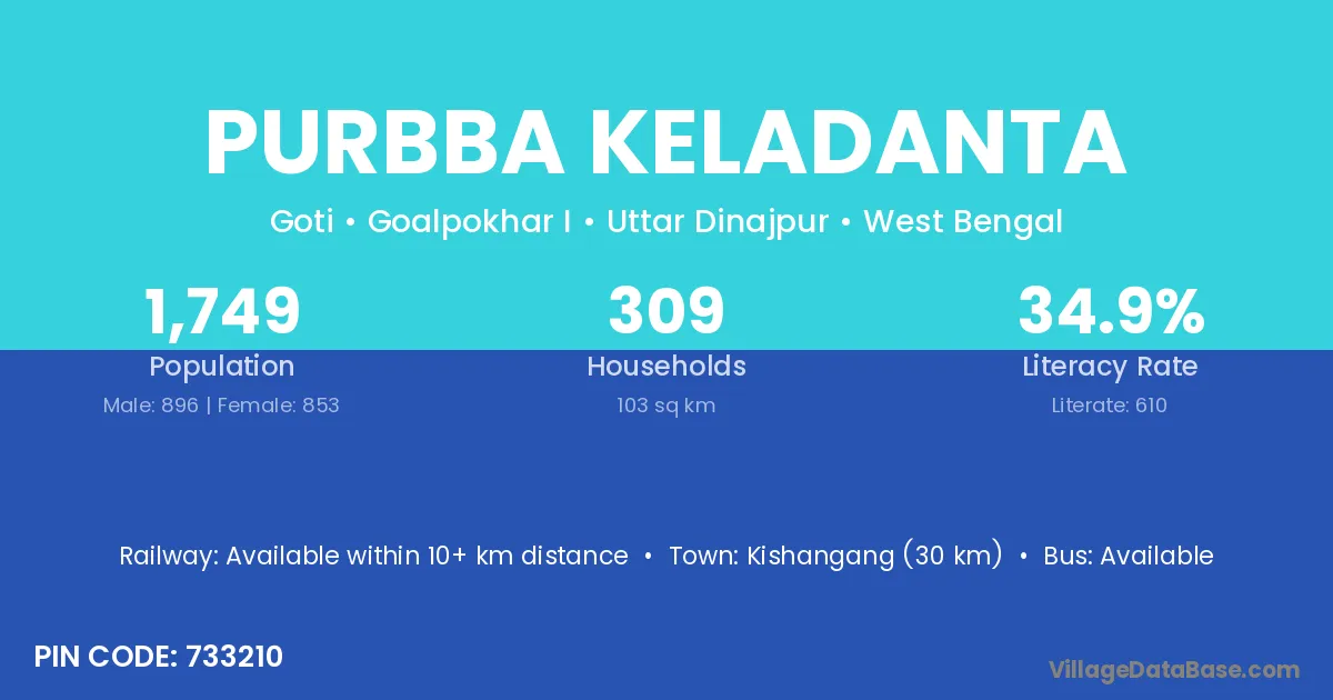 Kishangang (30 km) is the nearest town to Purbba Keladanta village for major economic activities and is located approximately 30 km away.