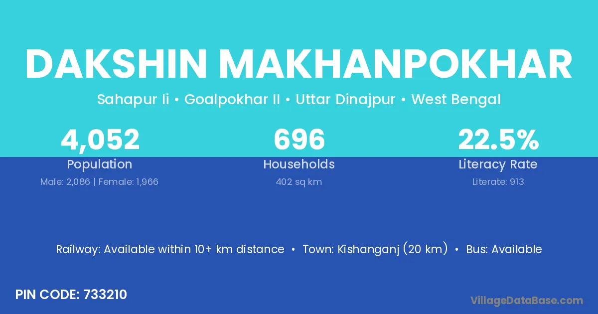 Kishanganj (20 km) is the nearest town to Dakshin Makhanpokhar village for major economic activities and is located approximately 20 km away.