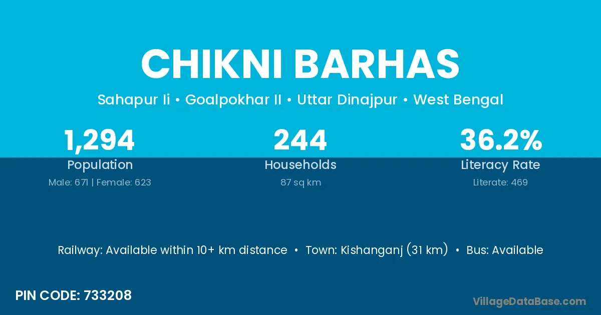 Kishanganj (31 km) is the nearest town to Chikni Barhas village for major economic activities and is located approximately 31 km away.