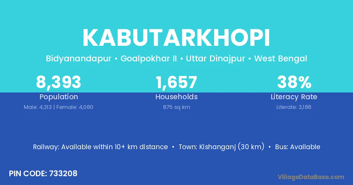 Kishanganj (30 km) is the nearest town to Kabutarkhopi village for major economic activities and is located approximately 30 km away.