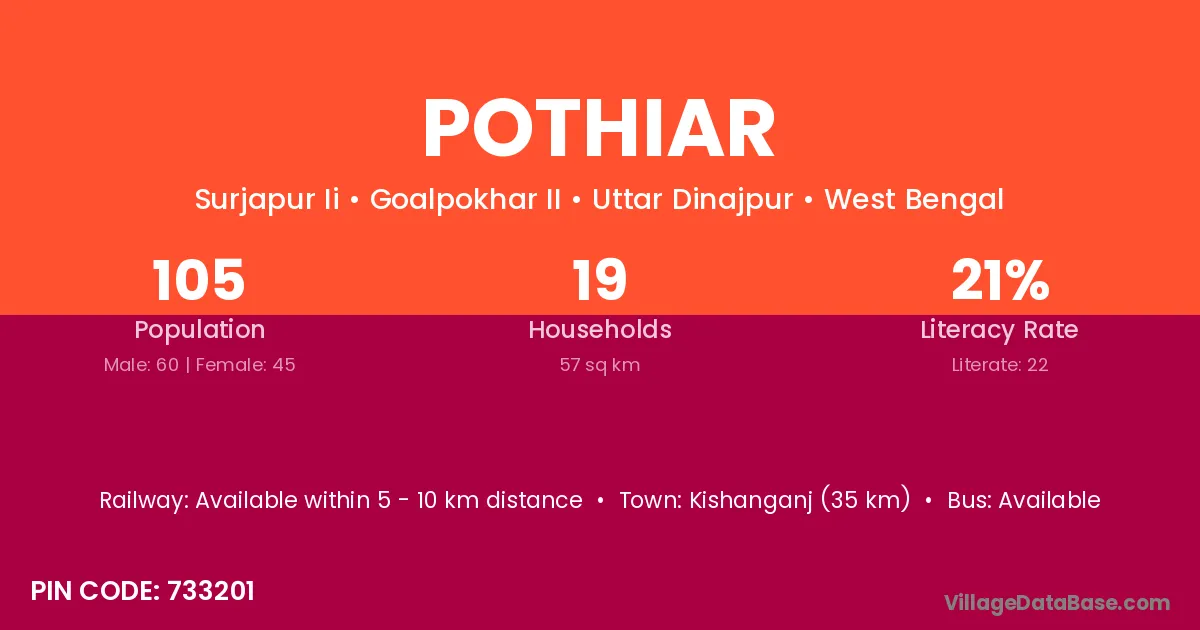 Kishanganj (35 km) is the nearest town to Pothiar village for major economic activities and is located approximately 35 km away.