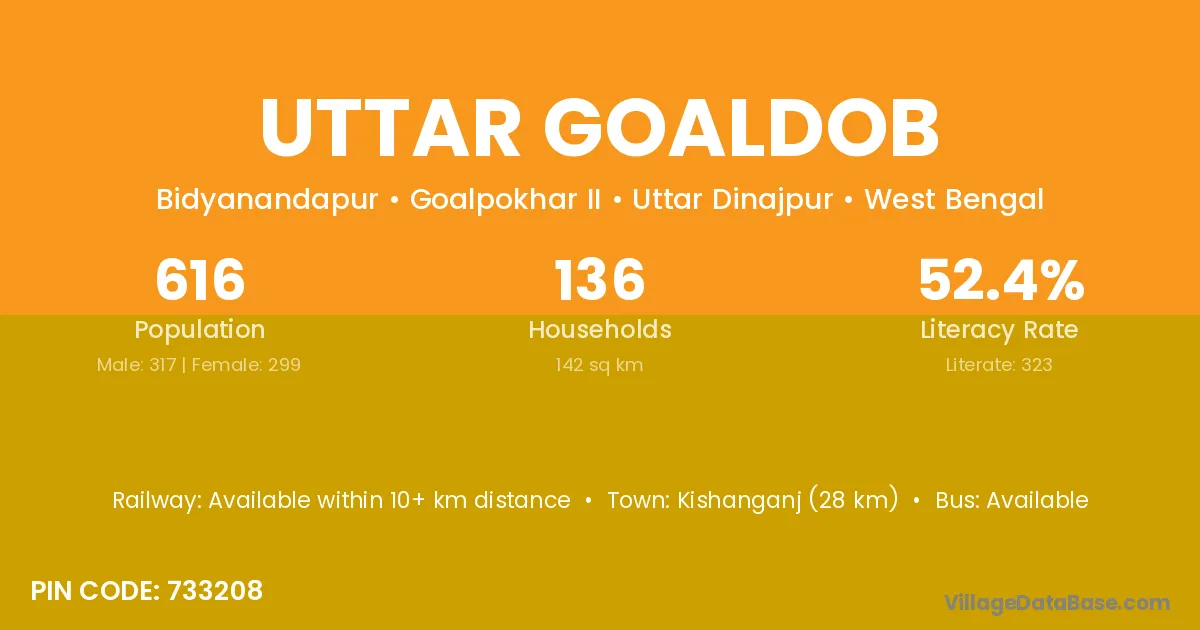 Kishanganj (28 km) is the nearest town to Uttar Goaldob village for major economic activities and is located approximately 28 km away.
